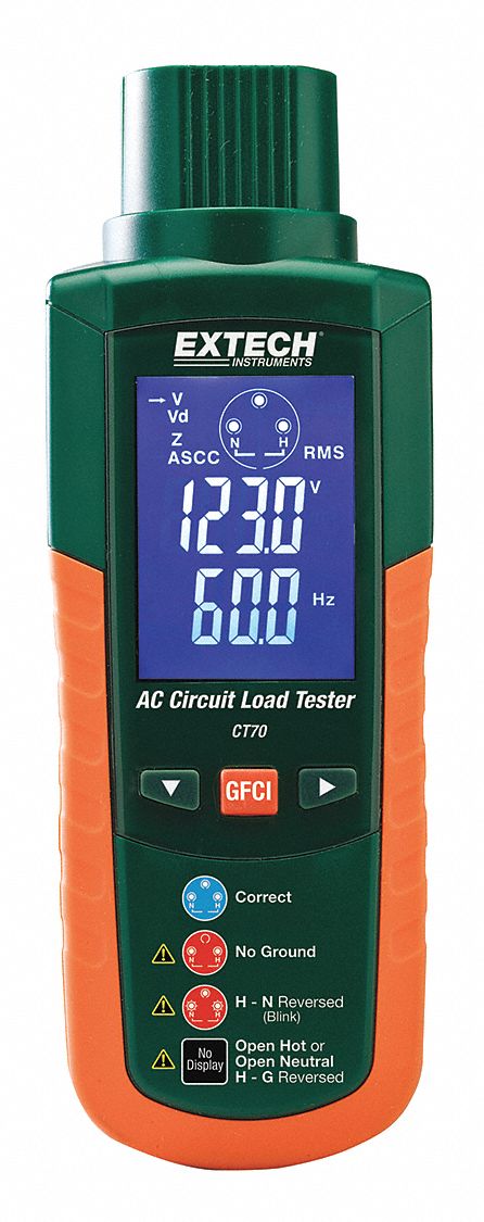 Extech ct70 ac circuit load tester. The extech ct70 gfci and ac circuit analyzer features outlet load handling capabilities plus outlet tester functions. Circuit and wiring issues can introduce shock hazards from grounding issues and can compromise performance of machinery and equipment from poor ground impedance lack of sufficient voltage under load and or high ground to neutral voltage. Circuit and wiring issues can introduce shock hazards from grounding issues and can compromise performance of machinery and equipment from poor ground impedance lack of sufficient voltage under load and or high ground to neutral voltage. Read honest and unbiased product reviews from our users.